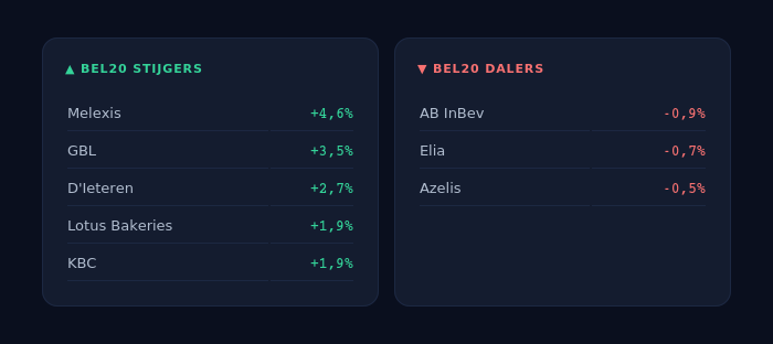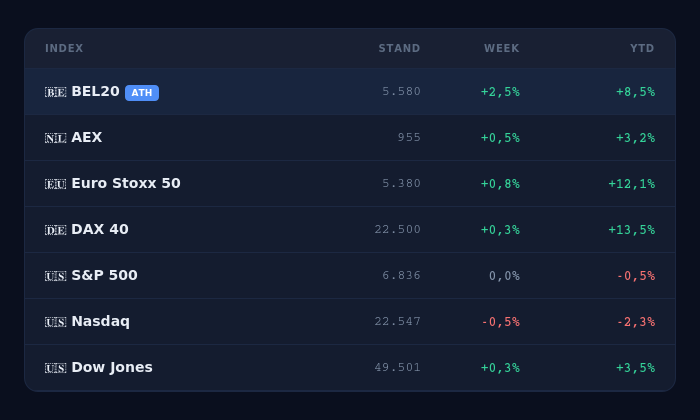 Het meest opvallende verhaal van de week is de BEL20 als Europese koploper. De Brusselse sterindex brak na 18 jaar eindelijk door zijn vorige all-time high. Trekpaarden deze week waren Melexis (+4,6%), GBL (+3,5%) en D’Ieteren (+2,7%). KBC zorgde donderdag voor extra vuurwerk met sterke kwartaalcijfers.