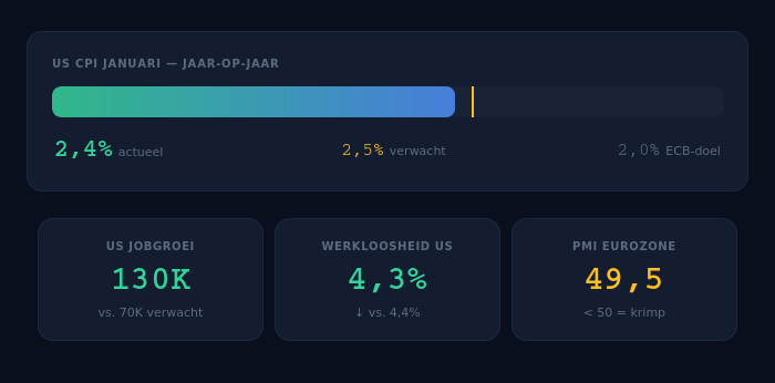 Deze week stond in het teken van inflatie en kwartaalcijfers. In de VS kwam het inflatiecijfer over januari uit op 2,4% op jaarbasis — iets lager dan de verwachte 2,5%. Op maandbasis steeg de CPI met 0,2%, ook onder de consensus van 0,3%. Op zich goed nieuws, maar de markten reageerden lauw. De reden: de kerninflatie, exclusief voedsel en energie, blijft hardnekkig en de Federal Reserve heeft weinig reden om snel de rente te verlagen.