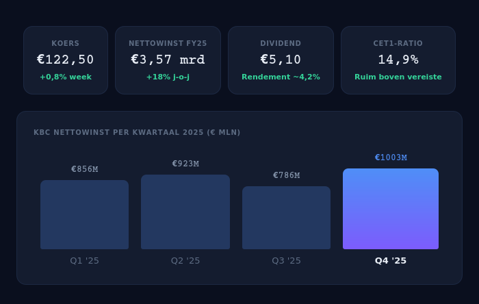 Het aandeel noteert momenteel rond €122,50. Met een dividendrendement van circa 4,2% en een sterk track record is KBC een typisch Belgisch kwaliteitsaandeel. Kanttekening: de Belgische bankbelastingen blijven een structurele last, en de groeiruimte op de thuismarkt is beperkt.