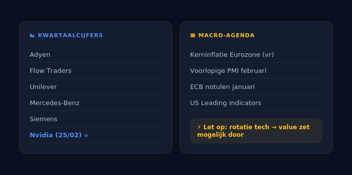 Macro-agenda: Vrijdag verschijnt de kerninflatie voor de eurozone (verwachting: stabiel rond 2,5%). Let ook op de voorlopige PMI-cijfers voor februari — een belangrijk kompas voor de Europese conjunctuur.