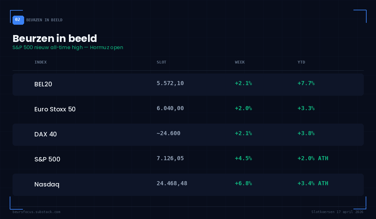 BeursFocus Editie #10 — S&P 500 op all-time high, Hormuz open en weer dicht, en beide portefeuilles in het groen
