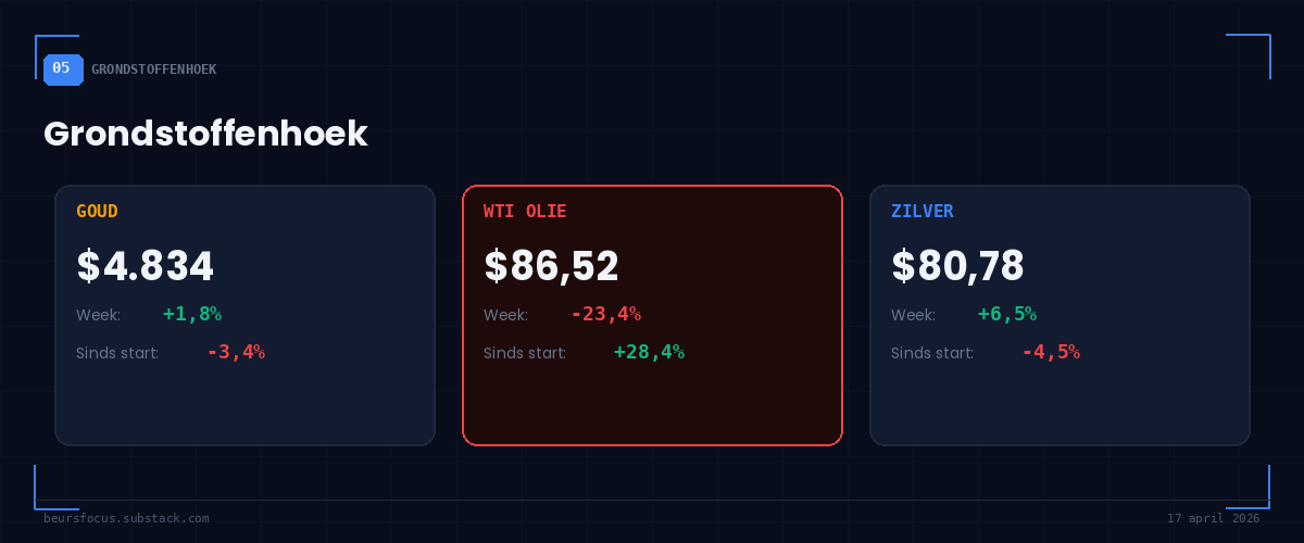 WTI crashte 23% in een week — van $112,90 naar $86,52. De Hormuz-opening is de directe oorzaak. Maar olie staat nog 28% boven de nulmeting: de markt is voorzichtig, want volledige normalisatie duurt maanden. Goud herstelt langzaam — centrale banken blijven kopen. WENS (onze energie-ETF) daalde deze week 4,3% maar staat nog +2,6% sinds start.