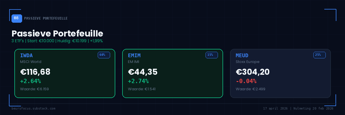 ⚠️ Disclaimer: De BeursFocus modelportefeuille is een fictief, educatief instrument. Dit is géén beleggingsadvies. Doe altijd je eigen onderzoek (DYOR).