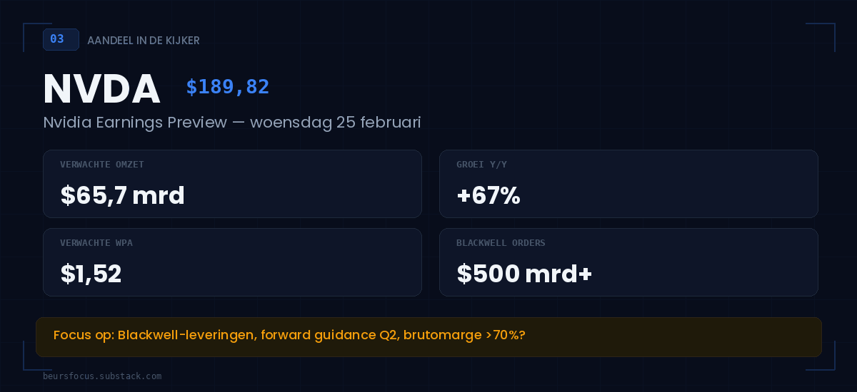 Nvidia earnings (wo 25 feb) — Het AI-moment van het kwartaal. Verwacht: $65,7 mrd omzet, $1,52 winst per aandeel. Na sluiting van de Amerikaanse beurs (na 22u Belgische tijd).