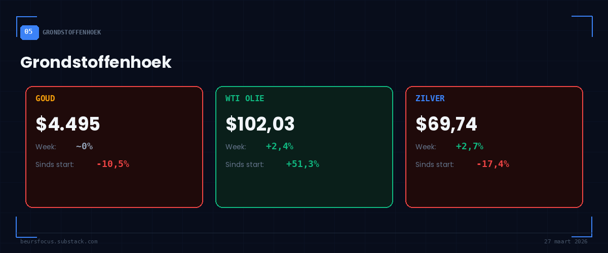 Goud stabiliseerde na de crash van vorige week (-10,4%). De daling van deze week was verwaarloosbaar (-0,04%). Beleggers lijken een bodem te hebben gevonden rond $4.500. Woensdag steeg goud 3% toen het vredesplan hoop gaf op lagere rentes — dat laat zien dat goud nog steeds reageert op renteverwachtingen, niet op oorlogsangst.