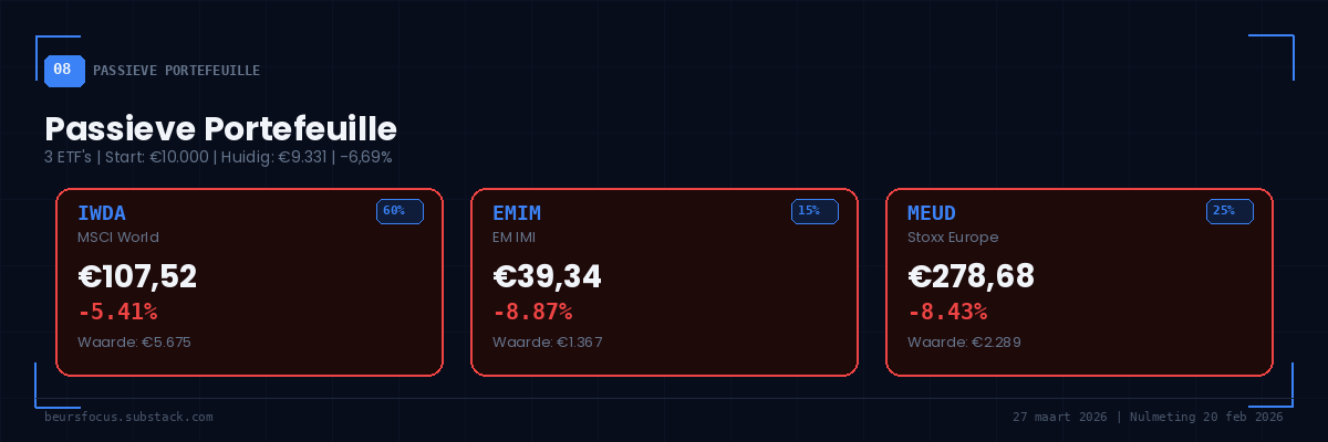 ⚠️ Disclaimer: De BeursFocus modelportefeuille is een fictief, educatief instrument. Dit is géén beleggingsadvies en weerspiegelt niet de persoonlijke portefeuille van de auteur. Doe altijd je eigen onderzoek (DYOR) en raadpleeg een financieel adviseur voordat je beleggingsbeslissingen neemt. Rendementen uit het verleden bieden geen garantie voor de toekomst.