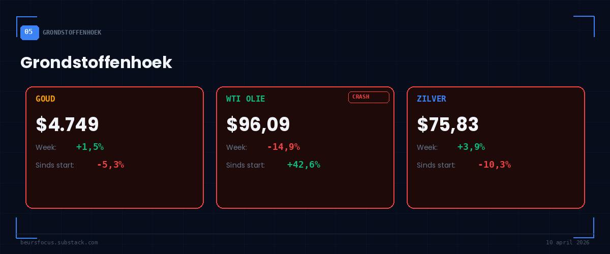 Goud steeg licht (+1,5%) ondanks de dalende geopolitieke spanning. Centrale banken blijven kopen — die vraag verdwijnt niet bij een bestand. Maar de goudcrash van twee weken geleden (-10% in één week) laat zien hoe snel het sentiment kan draaien. Onze IGLN-positie staat nog -5,8% — langzaam herstellend.