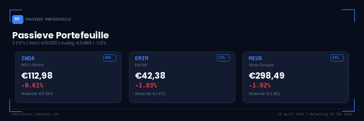 ⚠️ Disclaimer: De BeursFocus modelportefeuille is een fictief, educatief instrument. Dit is géén beleggingsadvies en weerspiegelt niet de persoonlijke portefeuille van de auteur. Doe altijd je eigen onderzoek (DYOR) en raadpleeg een financieel adviseur voordat je beleggingsbeslissingen neemt. Rendementen uit het verleden bieden geen garantie voor de toekomst.